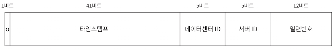 - 12비트를 할당한다. 각 서버에서는 ID를 생성할 때 마다 이 일련 번호를 1 만큼 증가시킨다. 이 값은 1 밀리초가 경과할 때 마다 0으로 초기화 (reset)된다.